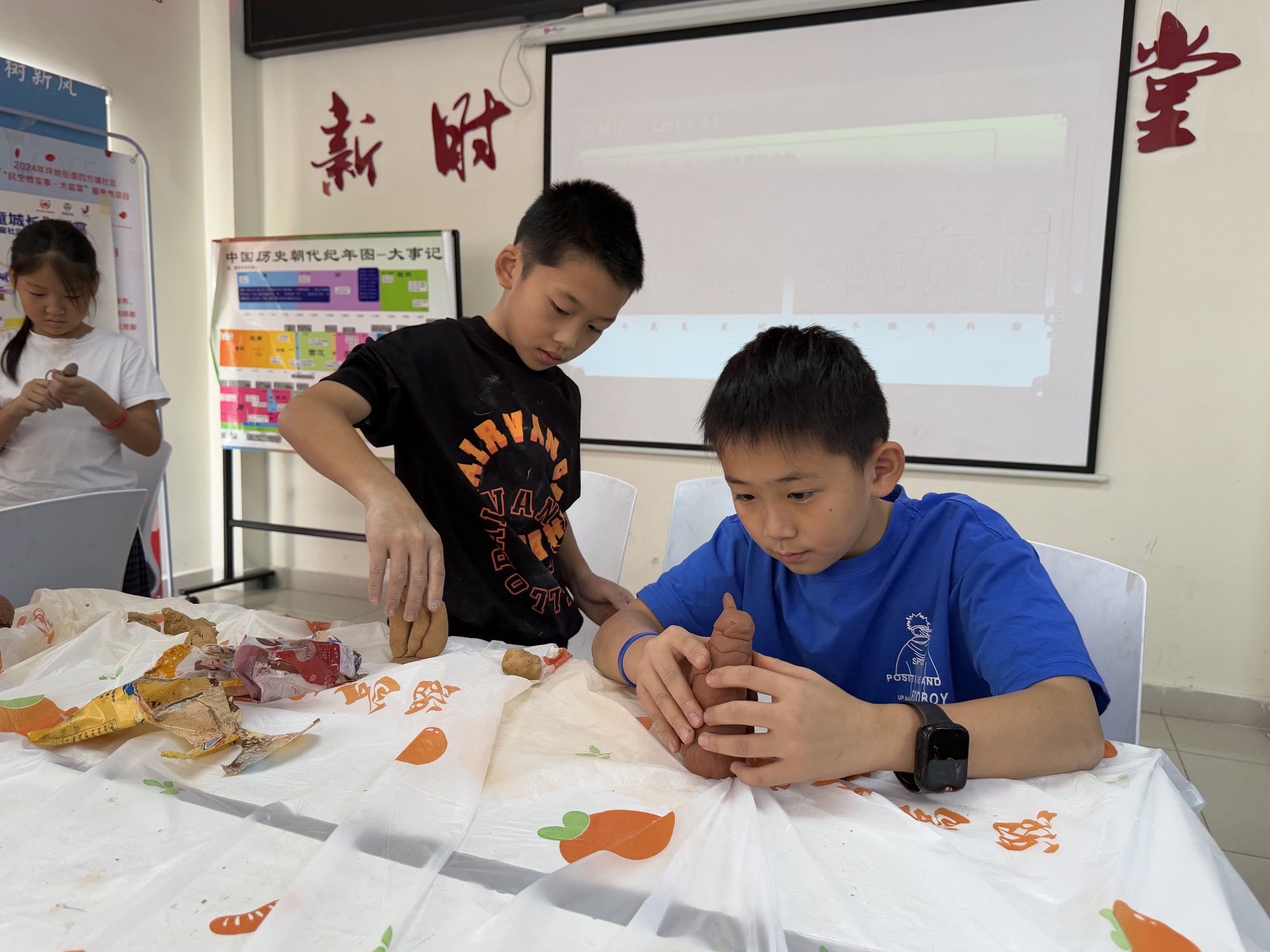 在文化讲解环节,讲师为孩子们介绍了十二生肖的历史渊源与排序传说,并引导大家思考生肖形象在历代文物与现代生活中的体现。随后进入手工黏土环节,孩子们在观察AI模型的基础上,用黏土还原自己理解的十二生肖陶俑。