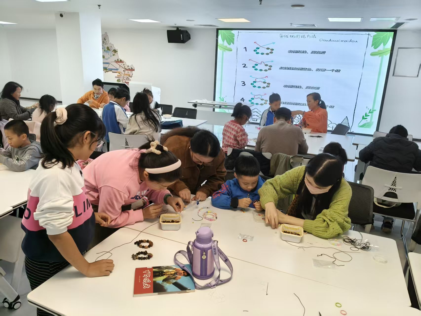 活动伊始,工作人员提前布置好温馨整洁的活动场地,通过趣味小游戏快速活跃现场气氛,让家长与孩子迅速融入活动中。随后,工作人员结合成品展示,详细讲解串珠的款式设计、穿线技巧及收尾固定方法,耐心解答家长与孩子提出的疑问,确保大家掌握操作要点。
