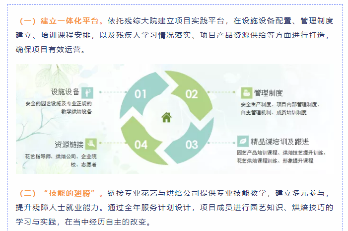 本项目以复元理论为指导,以坪山区有就业能力的残障人士为服务对象,通过花艺和烘焙体验的结合提升残障人士的就业能力,形成了一条自主运营、自主管理、自主研发的残障人士生产线。残障人士在学习过程中缓解压力、调解情绪、建立新的人际关系;在产品输出过程中培养自信心、实现市场价值及促进社会功能的康复。