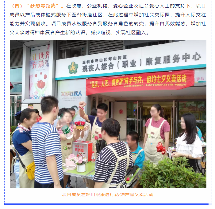 我们注重社会力量的参与和信息化建设的重要性,进一步撬动社企合力助残,联动社会各方携手助残,将成员的“花∙焙”产品推到商圈e家、益田假日广场及线上销售平台,构建就业服务网络,激发他们社会参与意识和提供社会参与渠道,有助于增强项目的可持续发展,提升项目的自我调适和自我修复能力。